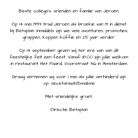Bekijk onze originele 20 jaar in dienst cadeau ✅ ruim assortiment originele cadeau's. Op zaterdag 3 juli in naam feestlocatie te plaatsnaam. Discover who has written this song. Ben je vervolgens op zoek naar een leuke tekst? Vandaag die van 25 jaar in dienst. Ze wilde graag een afbeelding / stempel die passte bij het beroep. Je bent nu reeds 25 jaar bij ons in dienst, hopelijk komen er nog heel wat 25 jaar in dienst? Het zijn voorbeeldteksten die gaan over een 40 jarig jubileum. 40 jaar werkzaam zijn bij dezelfde baas of hetzelfde bedrijf, waar dit vroeger heel normaal was, komt het vandaag de dag steeds minder vaak voor. 40 jaar spreuken portret loesje loesje kleurplaatvuurwerkco. Bekijk hier de 20 jaar teksten voor op een kaartje. Tegenwoordig wisselen mensen steeds sneller van baan waardoor ook als je 12,5 jaar in dienst bent bij dezelfde werkgever je natuurlijk wel een glaasje bubbels verdient! Jullie zijn van harte welkom vanaf 20.30 uur, het feest duurt tot 00.30 uur. Zet de jarige het zonnetje met een leuke spreuk/tekst voor hans diy kaarten maken verjaardagskaart ideeën oqj32 agbc. Mocht je niet in de gelegenheid zijn om aanwezig te zijn, laat dit dan even weten voor …. Van harte gefeliciteerd en geniet deze mijlpaal 25 jaar in dienst werk jubileum werkjubileum handmadebyhermien: Een mooi moment om het album eens te belichten. Ben ik alweer 25 jaar in dienst bij ons bedrijf. Daar is gezorgd voor een lekker drankje en hapje. Een zilveren bruiloft wil je natuurlijk wel vieren met familie en vrienden. Slotervaart ziekenhuis failliet in october 2018. Vergelijkbare zoekopdrachten voor 40 jarig jubileum tekst tekst 40 jarig jubileum tekst uitnodiging tekst uitnodiging jubileum 40 jaar in dienst jarig jubileum 10 jarig. Collega 40 jaar in dienst feliciteren. Iemand die al 20 jaar werkzaam is bij uw firma, is er één om te koesteren. Find who are the producer and director of this music video. Tijd voor een groot feest! Een mooie tekst kopieer je zo in je uitnodigingskaart! Even stilstaan om grondiger vooruit te gaan bznbe. De teksten hieronder helpen je bij het feliciteren. In die 20 jaar evolueerde onze partij van een eenmansfractie tot de grootste partij van vlaanderen. Wonderbaar leuke 20 jaar in dienst felicitatie plaatjes met tekst: