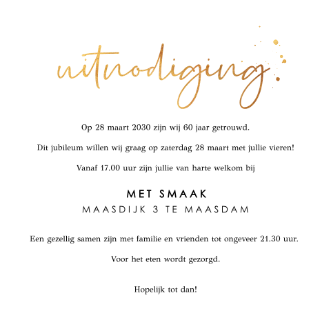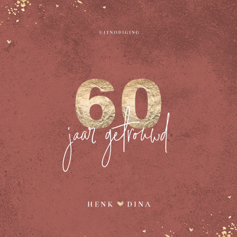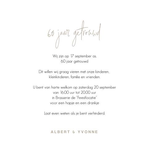 Jullie zijn 60 jaar getrouwd, gefeliciteerd met jullie diamanten bruiloft! Jullie zijn van harte welkom op onze receptie op datum van.
