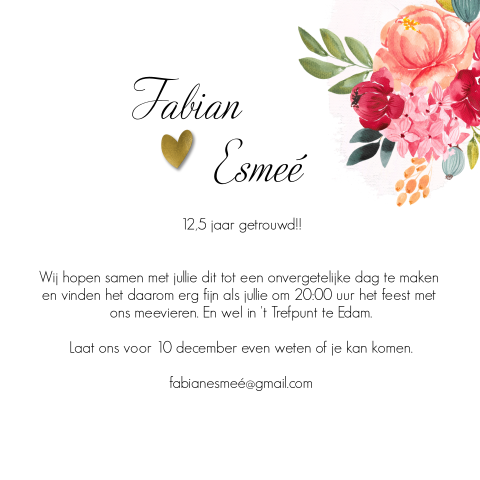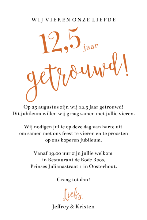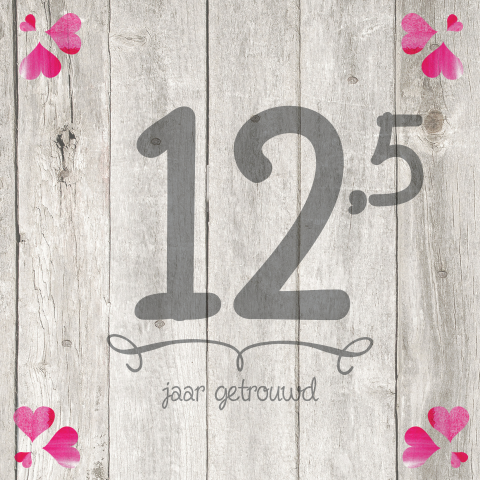 En hoewel we nu minder samen werken, hebben we nog regelmatig samen een ochtend waarbij we gaan ontbijten, een middag waarbij we samen even gaan winkelen en meer. Al 12,5 jaar getrouwd al 12,5 jaar man en vrouw elkaar al 12,5 jaar trouw dat moeten wij vieren met eten en drinken dit huwelijksbootje gaat nooit zinken voor altijd samen, nooit meer alleen dit is voor altijd, dat wisten wij meteen al 12,5 jaar. Kies een jubileumkaart uit onze mooie collectie en pas deze eenvoudig aan met jouw.
