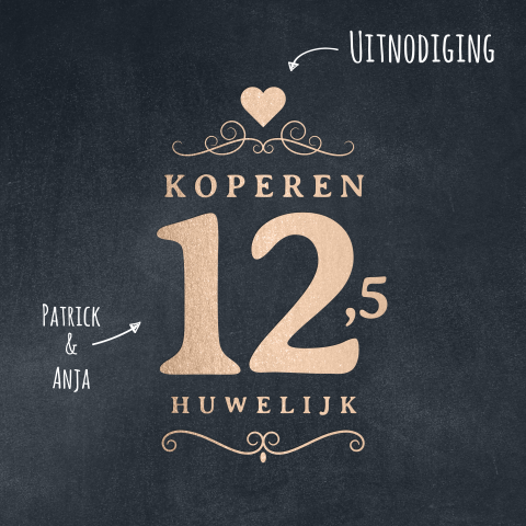 Bestel uw 12,5 jaar huwelijksversieringen voor 15:00 en u mag normaliter altijd de volgende dag levering verwachten! Kies een mooie uitnodiging met foto uit onze collectie. Wanneer een koppel 12,5 jaar samen is, noemt men dat in de volksmond een koperen huwelijk.