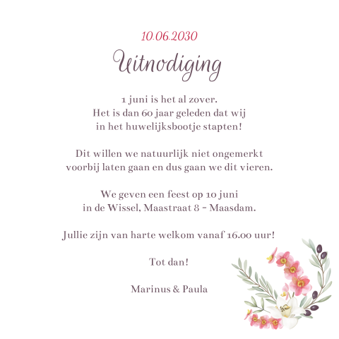Je vind 'm op uitnodigingen.nl. Bij made for moments vind je mooie uitnodigingen met ruimte voor een persoonlijke foto. Dat is een grootse mijlpaal, waarvan niet veel mensen kunnen zeggen dat ze dat bereikt hebben. Omdat we nog steeds heel blij zijn met elkaar, willen we dit graag met jullie vieren. In kleur, met elementen, eigen tekst en foto's. Bekijk hier mooie teksten voor op een 60 jarig huwelijk kaartje. Kaart een traditionele 60 jaar getrouwd uitnodiging kaart kun je kopen in elk winkelcentrum. Wonderbaarlijk tekst uitnodiging 25 jaar getrouwd â trouwpost. Tekst huwelijksjubileum 60 jaar getrouwd. Een mooi cadeau is om bijvoorbeeld glaswerk, spiegels, kristal te laten graveren met een persoonlijke tekst of afbeelding. Een mooie spreuk is zeker op zijn plaats bij dit feest. Spreuk 60 jaar getrouwd delen met anderen? Het diamanten huwelijk is reden voor een feest met kinderen, kleinkinderen, familie en vrienden! Prachtige 60 jaar teksten en spreuken op een rij. Wenskaart 60 jaar getrouwd gefeliciteerd. Vorige week vierden leny en wim hun 60 jarig huwelijksjubileum! Blik op lisse besteedt graag aandacht aan bruidsparen die 25, 50, 60 of 65 jaar getrouwd zijn en dit niet kunnen vieren of moesten annuleren vanwege de corona maatregelen. Simple verjaardag jaar with verjaardag 60 jaar. Het videoverslag van een superfijn weekend met de hele familie. 60 jaar getrouwd en nog steeds gelukkig? Verjaardagswensen 60 jaar + gefeliciteerd 60 jaar teksten: Zestig jaar terug, het was toen heel erg koud, in de winter zijn jullie toen samen echt getrouwd iedereen was blij, een aantal dagen vrij, jos en mien dat was heel goed, maar 't vergde toch wat moed, he. Als je bezig bent met het maken van je kaartjes bij kaartje2go, hebben wij ook nog wel een leuke tekst voor je! Zijn jullie binnenkort 60 jaar getrouwd? 50 jaar getrouwd huwelijkswensen en mooie teksten: Kijk voor de jaartallen in de. Teksten 60 jaar getrouwd voor bij een mooie bos bloemen! Een diamanten huwelijk, 60 jaar getrouwd is het vieren waard! Vandaag zijn leny en wim 60 jaar getrouwd. Wat moet het bijzonder zijn om 60 jaar getrouwd te mogen zijn.en beide in redelijk goede gezondheid, nog volop. 4 augustus was voor velen een dag als andere dagen, maar voor dit echtpaar was het heel bijzonder.
