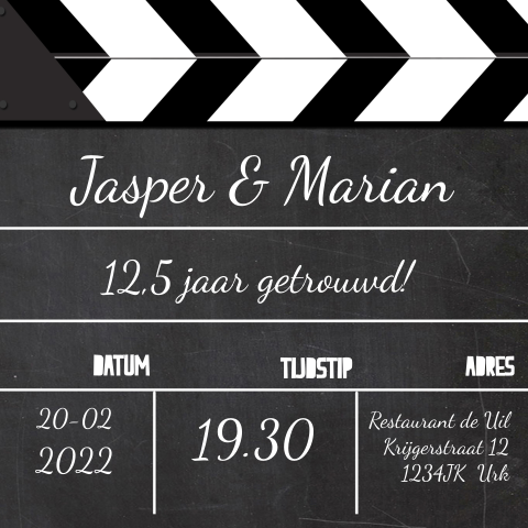 Toegevoegd aan je collectie deze kaart is nu toegevoegd aan tekst 50 jaar huwelijk uitnodiging eigen collectie. Hippe enkele foto 25 jubileumfeest uitnodiging met krijtbord print, fotostrip, kraft label en losse teksten. Kijk dan hieronder om inspiratie op te doen. Pas het kaartje eenvoudig aan naar je eigen wens met onze online ontwerptool en bestel een proefdruk. Jubileum uitnodiging 12,5 jaar getrouwd. Maak deze feestelijke uitnodiging met houten wasknijper en pas eenvoudig het jaartal aan hippe enkel uitnodiging voor jullie huwelijksjubileum feest met krijtbord print! Uitnodiging tekst voor een verjaardag. Hieronder vind je een paar gedichten ter inspiratie voor de uitnodiging van jullie 12,5 jarig huwelijk. Tekst & gedichten 12,5 jaar getrouwd. Een 12,5 jaar huwelijks uitnodiging kan dan niet ontbreken. Alle jubileumkaarten zelf maken ontwerp samen met goudfolie sluitzegels verzendservice. Jubileum huwelijk teksten voor op een jubileumkaart. Ik wil jullie graag uitnodigen om dit met mij te vieren jullie zijn vanaf 15.00 uur van harte welkom op het feest bij. 65 jaar worden is een bijzondere aangelegenheid en dit moet je dan ook vieren! Gefeliciteerd met jullie koperen bruiloft! Laten we samen mijn 30e verjaardag vieren. Laat dan als reactie op dit bericht even weten welke. Geef jij een feestje voor je verjaardag? Kom met ons proosten op de volgende jaren! Liefde is warmte, liefde is echt. Gefeliciteerd met jullie koperen bruiloft! Wij zijn 12,5 jaar getrouwd! Met vaste lijnen, ruimte voor jullie eigen foto en losse teksten. Dan wil je vast en zeker mensen het is alweer 12,5 jaar geleden dat wij ja zeiden. '12 en een half jaar getrouwd', of een koperen jubileum, is een mijlpaal die wij vooral in nederland vieren. Lovz | uitnodiging 12,5 jaar getrouwd foto, lijnen, kraft print. Maak een jubileum uitnodiging online bij lillybird. Via kaartje2go kun je gemakkelijk en snel de mooiste uitnodigingskaartjes maken. Het leven samen is heel bijzonder zo veel dingen delen met elkaar tegenwoordig bijna een wonder maar wij doen dat al 12,5 jaar! Kies een jubileumkaart uit onze mooie collectie en pas deze eenvoudig aan met jouw eigen teksten uitnodiging 12 5 jaar getrouwd. In kleur, met elementen, eigen tekst en foto's.