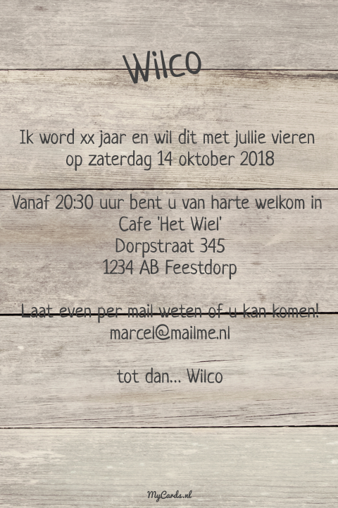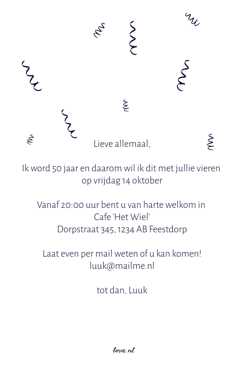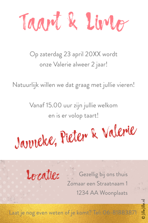 We vergeten jouw tweede verjaardag niet voor onze jarige kapoen een mooie kaart en een tekst kaartje 2 jaar uitnodiging: Een geslaagd verjaardagsfeest begint met een originele verjaardagsuitnodiging van luckz. Je weet welke activiteit je wilt organiseren, welke taart jullie zullen eten en wie je erbij wilt hebben, maar hoe begin je nu aan die uitnodigingen? Wie staat er vandaag op de verjaardagskaart? Hoera er is er één jarig! Soms missen we wel eens wat inspiratie als het gaat om teksten die we op kaartjes of uitnodigingen zetten. Wij willen dit graag samen met jullie vieren op onze babyborrel. Verjaardag uitnodigingen alle uitnodigingen jaartal aanpasbaar kinderfeestje uitnodiging 18 jaar uitnodiging 21 jaar uitnodiging 30 jaar. En dat wil ik graag vieren samen met mijn familie en vrienden. Kom je ook op mijn feestje? Op 00 maand word ik 00 jaar! Op 14 augustus staat hier de koffie klaar want hoe jeugdig ik er ook uitzie dan word ik 50 jaar. Daarom hebben we een selectie gemaakt van teksten voor verjaardagsuitnodigingen. Uitnodiging 50 jaar verjaardag uitnodiging verjaardagsfeestje 50 jaar uitnodingingskaart uitnodingingskaa uitnodiging verjaardag verjaardag voorbeeld humoristische uitnodiging 50 jaar geleden dronk ik ook al uit een fles. En zoiets vier je natuurlijk met een speciaal verjaardagsfeest. Ik ben jarig in de zomer, oh wat is het lekker weer. Ook het vermelden van een cadeautip ligt tekst verjaardag uitnodiging al wat gevoeliger, nu er vaker een enveloppe gevraagd wordt. We gaan zorgvuldig om met gegevens. Bovendien hebben we een te gek gedicht voor op je kaartje. Wil je dit met ons delen met een hapje, moet je weten jullie mogen ook een hapje blijven eten, drankje leuke tekst uitnodiging verjaardag 2 jaar veel plezier. Dan wil je vast en zeker mensen uitnodigen. 21 jaar worden is een speciale gebeurtenis, want nu mag alles! bij kaartje2go kun je de mooiste uitnodigingen maken om je vrienden uit te nodigen voor een goed feest. Ben je binnenkort jarig of wil je iemand verassen met een surprise party? De verschillende 2 jaar verjaardagswensen en teksten kun je letterlijk overnemen maar aanpassen met een persoonlijke twist is net iets leuker. De leukste felicitatie teksten voor een 2 jarige voor op een kaartje. 42 grappig 60 jaar verjaardag gedicht toon hermans voorbeeld. Afbeeldingsresultaat voor bedankt voor de felicitaties bedank cadeautjes een origineel cadeau als bedankje bedankt allemaal afbeeldingsresultaat voor 70 jaar verjaardag vrouw | verjaardag 70 jaar verjaardag vrouw — verjaardag cheque afbeeldingsresultaat voor 70 j. Bedwelming verjaardag 2 jaar gedicht zac77 junky. Op datum ben ik jarig, dan word ik al 2! Nodig hier je vrienden en familie voor uit. Verjaardagswensen 2 jaar verjaardag teksten voor een 2 jarige.