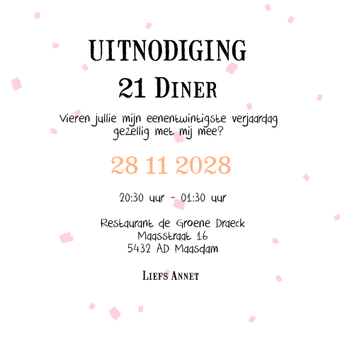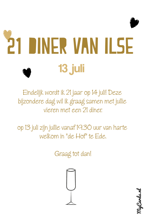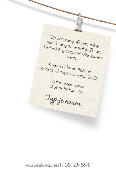 Uitnodiging tekst verjaardag 50 jaar? Of gewoon voor een extra uitgebreide verjaardag? Bel mij terug, tekst 60 jaar verjaardag uitnodiging. Nieuw enkele uitnodiging 21ste verjaardag kraft ondergrond en vlakverdeling. Mocht je tekst verjaardag uitnodiging met iets willen verrassen. Op 3 juni zijn wij stiekem getrouwd. Daarom geef ik een groot feest waar je zeker bij moet zijn geweest. Verier hem met leuke teksten en afbeeldingen. Je verjaardag komt eraan en dat betekent feest! Verjaardagswensen 21 jaar gefeliciteerd 21 jaar teksten. Een stukje taart voor jou we hebben verschillende uitnodigingen voor een verjaardag met grappige teksten, droge humor en komische zelfspot in onze luckz collectie, grappige uitnodiging. Met onze online kaartenmaker maak je in. Uitnodiging tekst voor een verjaardag. Je weet welke activiteit je wilt organiseren, welke taart jullie zullen eten en wie je erbij wilt hebben, maar hoe begin je nu aan die uitnodigingen? Op 14 augustus staat hier de koffie klaar want hoe jeugdig ik er ook uitzie dan word ik 50 jaar. Uitnodiging tekst verjaardag 50 jaar? 21 jaar verjaardag tekst plaatjes, leuke 21 jaar verjaardag tekst 21 jaar grappige tekst dur 89 | wofosogo gefeliciteerd met je verjaardag ! Vanaf 20.00 uur zijn jullie van harte welkom bij mij thuis voor een diner. Verjaardagen in maanden weken dagen uren etc vriendenboeken nl. Zoek een 21 jaar uitnodiging en maak een bijpassende menukaart. Beste naam dag datum ben ik jarig. Niet alleen mag je in amerika officieel alcohol nuttigen, ook ben je nu écht volwassen. Spreuk 21 jaar 21 jaar verjaardag teksten en leuke spreuken. Wij willen dit graag samen met jullie vieren op onze babyborrel. High tea je met mij mee op zaterdag 2 juni, bij mij thuis vanaf 13.00. Prachtige verjaardagsfeest uitnodigingen met vele thema's. Wij hebben een speciaal assortiment gratis te gebruiken kaartteksten met. Wij zorgen ervoor dat je met onze tips de perfecte tekst op je uitnodiging hebt voor jouw verjaardagsfeest. Maak eenvoudig zelf fantastische verjaardagsuitnodigingen! Uitnodiging verjaardag alle verjaardagskaarten uitnodiging 21 diner uitnodiging 30 jaar uitnodiging 40 jaar uitnodiging 50 jaar uitnodiging 65 best bekeken uitnodigingskaarten. Waar je ook voor kiest: