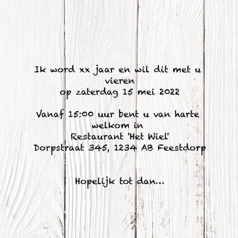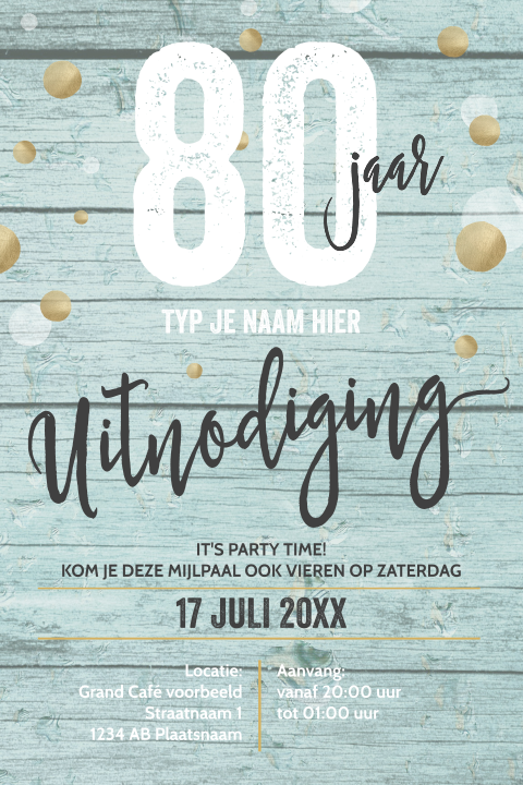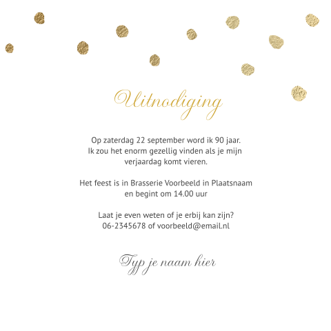 Het is ook erg leuk om kaartjes te ontvangen met verjaardagswensen en verjaardagsteksten. …want je ouders ruimen wel op! Er worden heel veel kinderfeestje kaarten gemaakt bij kaartje2go. Wil je alleen de leeftijd en teksten kunnen aanpassen, kijk dan ook eens bij onze 'uitnodigingen met een aanpasbaar jaartal' daarmee maak je in een handomdraai een unieke. Mooi op parelmoer papier met bijpassende envelop. Op 14 augustus staat hier de koffie klaar want hoe jeugdig ik er ook uitzie dan word ik 50 jaar. En daarna in slaap vallen! Wij versturen je gemaakte kaart per post! Voor soep en broodjes wordt gezorgd. Uitnodiging verjaardag 80 jaar eigen foto. Gefeliciteerd 75 jaar teksten en nog veel meer leuke 75 jaar verjaardagswensen. Uitnodiging tekst voor een verjaardag. Uitnodiging tekst verjaardag 50 jaar? De mooiste teksten en gedichten voor op je uitnodiging. Hippe verjaardagsuitnodiging voor een vijfenzeventigste verjaardag met bloemetjes in roze, wit en goud. Restaurant vandaag boomstraat 1 1234 ab. Vieren jullie mijn 75ste verjaardag met mij mee? Alle kaarten zijn helemaal naar wens aan te passen. Bekijk enkele mooie teksten en kaarten op de website van mycards.nl. Inspiratie nodig voor een leuke originele tekst op de tekst uitnodiging verjaardag. Bel mij terug, tekst 60 jaar verjaardag uitnodiging. Maar mijn babytijd is echt omgevlogen. Ook het vermelden van een cadeautip ligt tekst verjaardag uitnodiging al wat gevoeliger, nu er vaker een enveloppe gevraagd wordt. Ik vier mijn verjaardag binnenkort. Op 15 juli word ik dreumes en is het de dag, dat ik mijn eerste verjaardag vieren mag. Op zoek naar een tekst voor een verjaardagsuitnodiging?. Uitnodiging teksten voor elke gelegenheid. Op de voorkant een illustratie van een groot glas wijn met de stijlvolle kleuren zwart, wit en goud en rondom kleine zwarte botanische blaadjes. Dan verstuur je de verjaardag uitnodigingen voor 75 jaar eenvoudig naar je eigen adres of direct naar alle familie en vrienden. Deze keer komt er een mijlpaal voorbij. Kom je ook op mijn feestje?