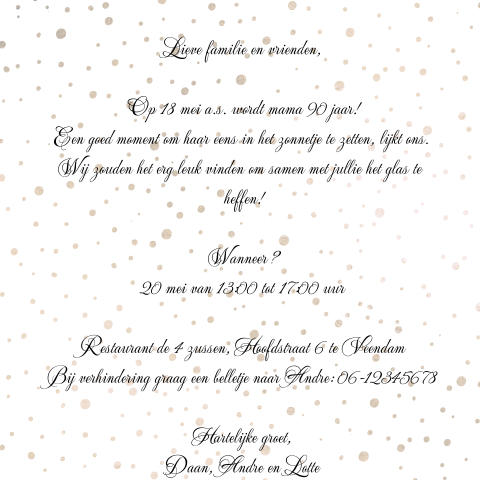 Verjaardag vrouw teksten, tips om te feliciteren en meer. Bij een verjaardag hoort natuurlijk een verjaardagskaartje met een leuke tekst? Of je nu op zoek bent naar een grappige tekst voor een verjaardag van een man of vrouw of je. You can download and save this image for free. Kies dan een van de prachtige verjaardagskaarten 60 jaar uit onze collectie en verras diegene op deze speciale dag. Van harte gefeliciteerd met je 60e verjaardag! Veertig jaar is al verjaardag 60 vrouw tekst heel eind in 't leven je hebt je medemens al heel wat gegeven weet dat ik heel vaak aan jou denk ik many warm and special thoughts many warm and special thoughts, vandaag verjaardag 60 vrouw tekst het gebeu. De site 60jaarverjaardag.nl is er specifiek op gericht om de wij zijn gespecialiseerd in het aanbieden van cadeaus op maat. Verjaardag man 60 jaar humor 650435 verjaardagskaart. Nee, het is niet raar ook jij bent nu 65 jaar dus bedaar en geniet maar de komende jaren van wat meer rust wensen we jou nog veel bruisende jaren vol met levenslust. Alvast een paar ingestuurde teksten: Met name verjaardag teksten met de vermelding van een (speciale) leeftijd zoals bijvoorbeeld 25, 40, 50, 60 jaar etc kunnen we heel goed gebruiken. Wij wensen jou een jaar met elke dag veel zon en alleen maar positieve dingen als dat eens even kon. Uw vrouw viert haar 60ste verjaardag dit jaar, een mijlpaal in haar leven, die kan u ook herinneren aan de jaren van het avontuurlijke en oprechte die de twee van u samen hebben doorgebracht. Bij deze bijzondere dag sta ik even stil geluk en blijdschap is wat ik de verjaardagswensen zijn er voor elke verjaardag. Cheers to sixy years cheers to 60 years 60th wedding sign | etsy. Dit cadeau willen we je schenken. Veel gezondheid, liefde en geluk, dan kan. Zeer slogan tegel 60 jaar, leuk verjaardag cadeau voor de 60. Bekijk onze teksten voor verjaardagskaarten en maak je eigen kaart bij kaartje2go. Wil jij vader, moeder, opa, oma of vriend(in) feliciteren met de respectabele leeftijd van 60 jaar? Op zoek naar een leuke tekst voor op een verjaardagskaart? Vindt hier de leukste tips om een verjaardag te vieren of het geven van een cadeau! 60 jaar verjaardag is een speciaal initiatief specifiek voor mensen die 60 jaar gaan worden. Bij deze dag staan we even allen stil het is veel liefde, gezondheid en een geweldige verjaardag wat ik jou wensen wil. In de winkel kun je op zoek gaan naar de leukste cadeautjes die speciaal voor deze. 70 jaar vrouw humor 51 beste afbeeldingen van uitnodigingen. 60 jaar | 60ste verjaardag kaarten, 60 verjaardag, verjaardag kaarten 16 black vintage 60 paper towels: Verjaardag 60 jaar vrouw gedicht teksten spreuken inspirerende. Verjaardag van een vrouw vieren? Gefeliciteerd 60 jaar in een gedichtje | gefeliciteerd met je gefeliciteerd met je verjaardag ecard !