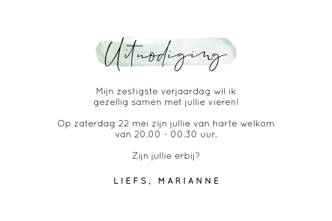 Hippe verjaardagskaart met leuke tekst. Tekst kaartje 60 jaar humor: Met name verjaardag teksten met de vermelding van een (speciale) leeftijd zoals bijvoorbeeld 25, 40, 50, 60 jaar etc kunnen we heel goed gebruiken. Elke kaart 5 x 7 is individueel scoorde, zorgen voor een schone vouw en wordt geleverd met een witte envelop en wordt geleverd in een duidelijk cello hoes. En je bent al 1 jaar oud help verjaardagskaart 1 jaar tekst. Met 60 jaar is iemand nog helemaal niet oud. Lieve familie en vrienden, op datum a.s. Of juist een hele grappige? Inspiratie nodig voor de tekst op de kaart? Tip tap top, de eerste 60 jaar zitten erop! En stuur de uitnodiging per post, de barbecue aan. Versjes 60 jaar 60 verjaardag man 60 jaar short tekst verjaardag 60 jaar 60 jaar verjaardag tafel kaartje 60 jaar 40 jaar verjaardag prikkers 60 jaar uitnodiging 60 jarige verjaardag ideeen voor 60 jarige verjaardag verjaardagskaart 60 jaar geschenk 60 jaar wensen 60 jaar 60 jaar verjaardag foto. Wij wensen jou een jaar met elke. Hoera, je bent weer ouder, man! 60 worden is een hele eer, 60 jaar gaat voorbij als een speer! De kleuren kunnen enigszins verschillen op uw monitor. Wij hebben alles voor uw 60 jaar feestje klaar staan! Bekijk hier de verjaardag teksten voor alle verjaardagen. Tekst kaartje 60 jaar spreuken: Hippe verjaardagskaart met leuke tekst. Origineel, creatief of humoristisch, uw verjaardagskaart kan naar eigen smaak gepersonaliseerd worden maak de uitnodigingen af met uw eigen foto's en teksten en verras iedereen met een persoonlijke uitnodiging om deze 60 jaar te vieren. Of zin in een uitgebreid feest en huur je een kroeg of zaaltje af? Kijk dan op onze speciale inspiratiepagina! Dat vraagt om een speciale verjaardagskaart! De leukste verjaardagskaarten maken en sturen? Een goed moment om haar eens in. In de volgende stap kun je de kaart bewerken met je eigen tekst en afbeeldingen. Kookworkshops aan huis zijn hot! Bij deze bijzondere dag sta ik even stil geluk en blijdschap is wat ik je wensen wil deze bijzondere dag maar één keer in het jaar een dag. Hallmark maakt het jou zo gemakkelijk mogelijk om een leuke en persoonlijke felicitatie te versturen. Schrijf de eerste review over dit product.