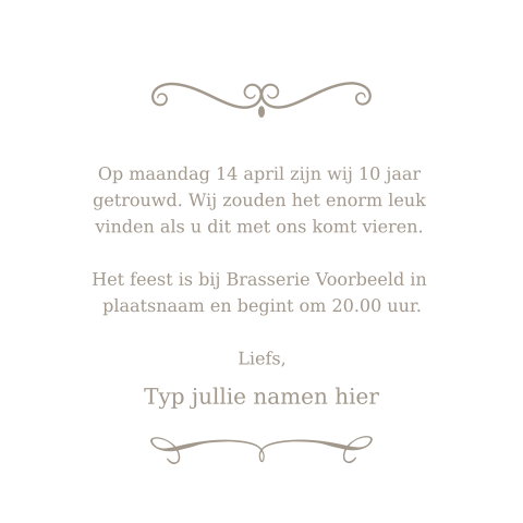 U bent zelf 10 jaar getrouwd of heeft vrienden of familie die hun tienjarig huwelijk, oftewel hun tinnen bruiloft, vieren. Er is 681 keer op dit gedicht gestemd. Tin staat voor die duurzaamheid en voor de. Kies nu uit duizenden gedichten, helemaal gratis. Veel koppels gaan alleen op reis of. Want de nmeeste stellen halen tegenwoordig die 25 jaar echt niet. Al op het verlovingsfilmpje in venetië 2001, klinkt het 'tot de dood ons scheidt'. U zult niet vinden dit tin stijl 10 jaar verjaardag frame ergens anders als dit ontwerp is uniek voor mijn winkel. Heeft u nog geen account? Wie kent gedicht 10 jaar getrouwd niet. Al 10 jaar samen met veel liefde en dat moet gevierd worden met jullie dierbaren! Het eerste jaar vloog voorbij. Al onze producten zijn voorzien van een certificaat van echtheid en worden rechtstreeks vanuit onze gieterij. Vind hier uw unieke geschenk voor uw tinnen jubileum! 10 jaar getrouwd oorkonde in word klik hier 10 jaar getrouwd oorkonde in pdf afdrukken, invullen en klaar is kees klik hier. Om je gerust te stellen in deze onzekere tijden, run ik een streng schoonmaakregime in mijn werkplaats. Ben je binnenkort 10 jaar getrouwd en wil je dit vieren met vrienden, collega's en familieleden? Eigenlijk zijn dat de belangrijkste elementen voor een geslaagde jubileumdag. Gefeliciteerd met jullie tinnen bruiloft! Een proefdruk van je kaart €0,99! 10 jaar getrouwd (tv episode). Het maken van uitnodigingen doe je op fuif.nl. Ik kan het me nog zo goed, als de dag van gisteren, herinneren. In deze collectie 10 jaar getrouwd kaarten staan hiervoor vele soorten uitnodigingen in alle kleuren en soorten. Het lijkt als de dag van gisteren, de early 10's. Ons 10 jaar oude trouwboekje en onze 2 dochters zijn daar ondertussen het levende bewijs. Gedichten hoeven niet te rijmen ok, het is misschien aardig als er hier en daar een zin tussen zit die rijmt. Inderdaad en dat is heel bijzonder omdat jan al 6 jaar patiënt is maar wat zijn wij dankbaar dat we deze dag in kleine kring mogen en kunnen vieren. Liefde is geven gedicht van toon hermans een dag zonder jou toon hermans every mom is a queen gelukkig nieuwjaar mooie mensen! Soms wordt er ook een feest gegeven om het tinnen jubileum te vieren. Je eerste grote mijlpaal bereik je als jullie 10 jaar samen zijn.