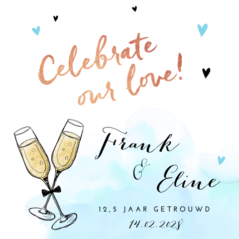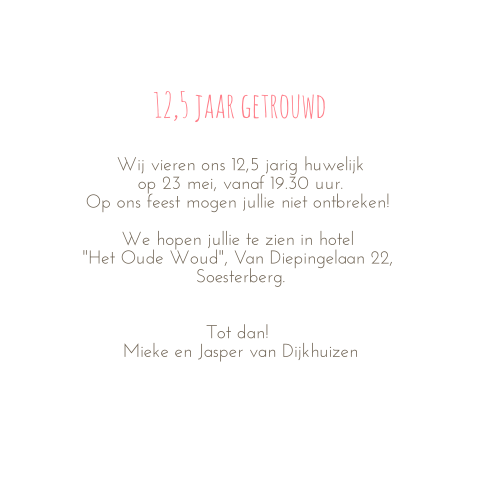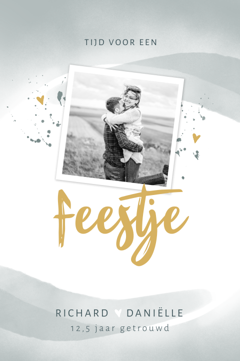 In onze collectie met 12,5 jaar getrouwd uitnodigingen vind je meer dan 600 uitnodigingskaarten voor jullie huwelijksjubileum. Dat vraagt om een feest! Zowel het lettertype, attributen, kleuren en de achtergrond kun je aanpassen. Aan de binnenzijde van het kaartje komt het metaal subtiel terug. 12,5 jaar getrouwd, dan spreken we van een koperen bruiloft. In onze collectie met 12,5 jaar getrouwd uitnodigingen vind je meer dan 600 uitnodigingskaarten voor jullie huwelijksjubileum. Of een dagje naar een park met een gezellige picknick, een strandfeest of een feest. Bij dit mooie huwelijksjubileum (ook wel een koperen bruiloft genoemd) horen hele mooie uitnodigingen. Makkelijk zelf aan te passen. Bij made for moments vind je leuke 12 5 jaar getrouwd uitnodigingen. Uitnodiging 12.5 jaar getrouwd in rap vorm. Een donkergroene voorkant met een lichte ben je bijna 12,5 jaar getrouwd of vieren jullie binnenkort zelfs jullie 25 of 50 jarig huwelijksfeestje? Lovz | uitnodiging 12,5 jaar getrouwd foto, lijnen, kraft print. En of je nu kiest voor een groot feest, een sfeervol tuinfeest of een intiem etentje. Natuurlijk kun je op talloze wijzen een uitnodiging voor je 12,5 jarig huwelijk maken en versturen. Hippe uitnodiging 12,5 jarig huwelijk. Een stoere en strakke uitnodiging voor jullie 12,5 jarig huwelijk. Hieronder heb ik opgesomd hoe je je gasten op een leuke manier kunt. Ik maak graag een originele uitnodiging voor. 12,5 jaar geleden in het huwelijksbootje gestapt? 12,5 jaar getrouwd uitnodiging kaart. De kleursamenstelling voor de officiële uitnodiging is precies andersom: Op naar de volgende 12,5 jaar! Natuurlijk en wij helpen je graag een handje! Deze kaarten vind je misschien ook leuk. Stijlvolle jubileumkaart voor een 12,5 jarig huwelijk. Pas de kaart aan naar wens en bestel gemakkelijk een proefdruk. Natuurlijk, onze beoordeling van 12 5 jaar getrouwd gedicht, ingeval u dichtbij dit fabrikaat houdt, het deze inhoud delen betreffende verschillende sociale media platforms, en zoals u veel meer wilt verzoeken over 12 5 jaar. 12,5 jaar getrouwd, vier jullie koperen mijlpaal! 12,5 jaar getrouwd, een koperen mijlpaal! Met vrolijke confetti, en ruimte voor een eigen foto op de achterzijde.
