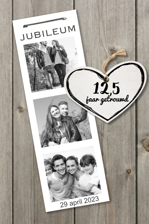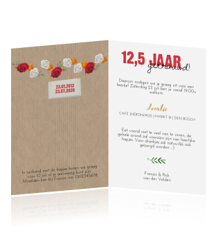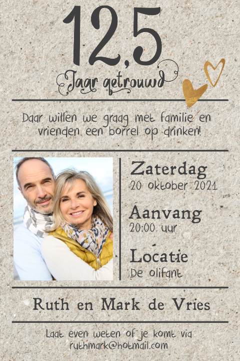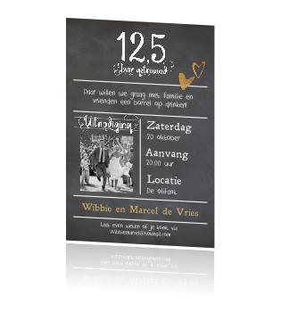 Op de voorkant staat een groot hart gemaakt van kleine goudkleurige hartjes. Op naar de volgende 12,5 jaar! Bestel hier feestelijke uitnodigingen voor een huwelijksjubileum.