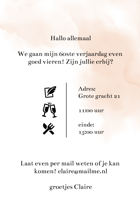 Maak een leuke uitnodiging verjaardag 60 jaar, pas eenvoudig tekst en kleur aan en maak gemakkelijk vooraf een proefdruk. Uitnodigingen maken om een bijzondere verjaardag te vieren met vrienden en familie dat.