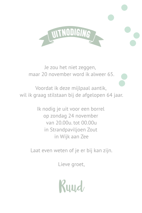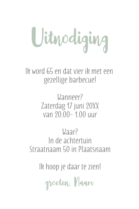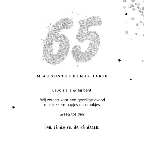 Pas de cijfers aan naar iedere gewenste leeftijd met de kaarten editor, bij. Uitnodigingen verjaardag 60 jaar voor vrouw of man in topkwaliteit! Een stijlvolle uitnodigingskaart voor 65 jaar met mooie witte en gouden letters op een sterretjes patroon achtergrondje.