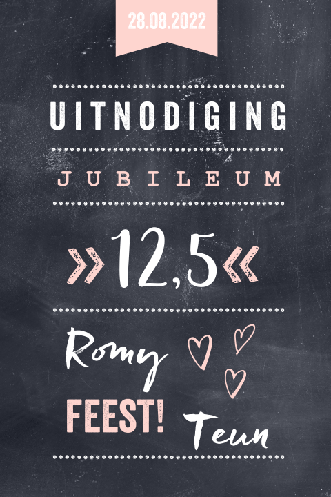 Met getal, ornamenten en krijtbord achtergrond. Pas deze uitnodiging helemaal aan naar wens. Kies een kaart uit de collectie jubileumkaarten of begin met een blanco. Zelf uitnodigingen maken 25 jaar getrouwd. Uitnodiging 12.5 jaar getrouwd in rap vorm. Deze kaarten vind je misschien ook leuk. Winkelmandje 0 items inloggen hulp. 12/5, 25 of 50 jaar getrouwd? Iegelijk heeft u zeker nodig voor u activiteiten die ze alle dag nodig hebben. Hier kun je eenvoudig tekst toevoegen en aanpassen, afbeelding weg halen of juist één van. Met kaartje2go maakt u eenvoudig de mooiste uitnodigen! Moderne uitnodiging voor koperen huwelijk, 12,5 jaar getrouwd. Account maken al een account? Uitnodiging huwelijk 12.5, 25, 40 en 50 jaar getrouwd | kaartje2go … (charlie ortega). Een koperen bruiloft is één van de eerste bijzondere jubileummomenten van jullie huwelijk. Op naar de volgende 12,5 jaar! Dat vraagt om een feest! Pas het kaartje eenvoudig aan naar je eigen wens met onze online ontwerptool en bestel een proefdruk. Het maken van een mooie, originele uitnodiging. Hieronder heb ik opgesomd hoe je je gasten op een leuke manier kunt. Een mooie 12.5 jaar getrouwd uitnodiging maken is bij mycards.nl erg eenvoudig. Onderaan dit artikel vind je drie voorbeeldteksten voor een 12,5 jarige huwelijks uitnodiging. Als je op internet zoekt, kun je voor elk jaar dat een jubileum gevierd kan worden een symbool vinden. Gefeliciteerd met jullie koperen bruiloft! We hebben prachtige uitnodigingen 50 jaar getrouwd voor jullie feest. Bent u binnenkort 50 jaar getrouwd? Wie kent 12 5 jaar getrouwd kado niet. Dat moet uiteraard gevierd worden met alle vrienden en familie. Makkelijk zelf aan te passen. Kies een mooie uitnodiging met foto uit onze collectie. 12,5 jaar getrouwd uitnodiging maken gratis proefdruk meeste tevreden klanten gratis pakketjes bekijk hier nog meer teksten voor jubileum uitnodigingen.