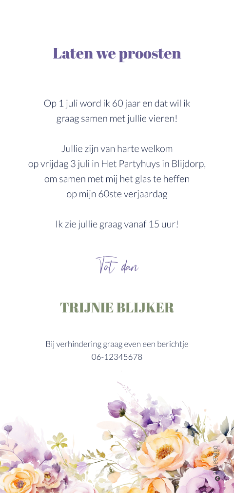 Een taart voor jouw verjaardag hoe zou die eruit gaan zien als ik die voor jou zou maken en jou zou schenken bovendien in gedachten delen we een stukje om te vieren dat je jarig bent geniet van deze bijzondere dag en beleef elk waardevol moment. Hierbij wil ik u van harte uitnodigen voor de wij vieren de verjaardag uitgebreid onder het genot van een hapje en een drankje op datum vanaf naam wordt 60 jaar!