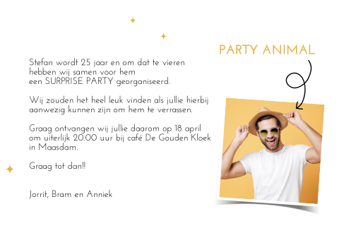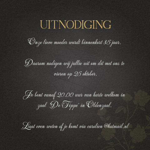 In locatie,adres, plaats jullie zijn dan ook van harte welkom voor een hapje en een drankje om. Kaart 50 jaar verjaardag met gouden spetters. De mooiste teksten en gedichten voor op je uitnodiging. Verjaardagswensen 25 jaar voor op een kaartje. Maak deze verjaardag extra speciaal met een mooie en betekenisvolle verjaardagswens. Verjaardag uitnodigingen alle uitnodigingen jaartal aanpasbaar kinderfeestje uitnodiging 18 jaar uitnodiging 21 jaar uitnodiging 30 jaar uitnodiging 40 jaar. Ik wil mijn 16e verjaardag graag samen met jullie vieren, op vrijdag 25 oktober. Kookworkshops aan huis zijn hot! Reden voor een feestje vinden wij… wij nodigen jullie uit om haar verjaardag mee te vieren op dag datum jaartal van tijdstip tot tijdstip uur in de feestzaal aan de adres. Nog een leuke tekst voor een huwelijksjubileum uitnodiging. Je weet welke activiteit je wilt organiseren, welke taart jullie zullen eten en wie je erbij wilt hebben, maar hoe begin je nu aan die uitnodigingen? Kom je op mijn feestje? Of je nu 30, 40, 50 of 80 jaar wordt, er is voor elk verjaardagsfeest een passende uitnodiging te vinden. Dit willen we samen met jullie vieren op datum a.s. Vanaf 00 uur ben je van harte welkom in. De volledige naam en de reden tot feesten. Uiteraard is de volgende verjaardagtekst ook bruikbaar voor elke andere leeftijd…. Uitnodiging voor een vijfentwintigjarig verjaardagsfeest in roze met zwart wit, vrolijke illustratie. U bent jarig of wil een dierbare een onvergetelijk feestje geven ? Wat voor tekst zet je op je persoonlijke uitnodiging voor je zilveren bruiloft? Dan wil je vast en zeker mensen uitnodigen. 25 years anniversary invitation to celebrate the event vector illustration. Fonkelnieuw uitnoding eerste verjaardag met foto cf 53 from. Vermeld in uw tekst uitnodiging verjaardag natuurlijk wie het feestvarken is. Eet je met mij mee op zaterdag 2 mei? Vindt hier de leukste tips om een verjaardag te vieren of het geven van een cadeau! Leuke verjaardag teksten,leuke teksten voor een verjaardag, elke verjaardag slaagt snel met de leuke verjaardagsteksten van 1verjaardag.nl. Wij hebben een grote collectie uitnodigingen voor verjaardagen in verschillende kleuren, stijlen en thema's. Op dag datum zijn naam en naam 25 jaar getrouwd. Teksten verjaardag uitnodigingskaarten 90 jaar: Bel mij terug, tekst 60 jaar verjaardag uitnodiging.