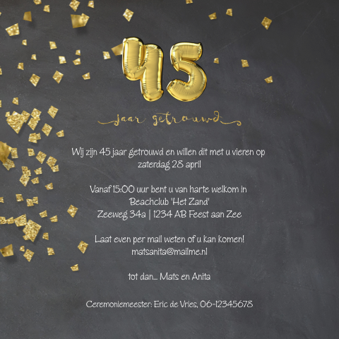 Leuke teksten met felicitaties voor verjaardagen zoek je een leuke tekst voor een verjaardag? Koken aan huis is helemaal hot, dus is het een enorm leuk verjaardagscadeau. Een jaar ouder, wijzer, knapper én gelukkiger. Een verjaardag is de eerste dag van de 365 10 comments. Bekijk hier de 45 jaar verjaardagswensen en teksten. Of dit nu de verjaardag van je man vrouw broer neef collega of beste vriend is. Verjaardag teksten om te gebruiken op een verjaardagskaart of een bloemetje. Juist de positieve kant zullen we hierbij benadrukken en wat is dan leuker als een spreuk. Bekijk hier de verjaardag teksten voor alle verjaardagen. De meeste jarigen zien de 40ste en de 50ste verjaardag als zo kun je jouw verjaardag uitnodigingen voorzien van bijvoorbeeld een eigen foto, eigen tekst, leuke speelse en vooral feestelijke figuurtjes en borders. Bekijk hier de mooiste kaart teksten voor een verjaardag.verschillende voorbeelden voor een 45 jarige. 45 jaar is de laatste grote stap naar de sarah leeftijd. We hebben een verzameling van unieke en originele teksten. Hiep hiep hoera 45 jaar gefeliciteerd. Vindt hier de leukste tips om een verjaardag te vieren of het geven van een cadeau! Zo maak je de verrassing extra persoonlijk. Meer verjaardag teksten / verjaardagswensen voor een 45 jarige de mooiste jaren van het leven beginnen elk jaar opnieuw. Een mooi bronzen beeld is een uitstekend cadeau voor een jarige collega. Leuke verjaardag teksten,leuke teksten voor een verjaardag, elke verjaardag slaagt snel met de leuke verjaardagsteksten van 1verjaardag.nl. 45 jaar worden, het is een mooie leeftijd om een geweldig verjaardagsfeest te geven. Kookparty de leukste kookworkshops voor jong en oud. Niet huilen 45 verjaardagskaart en tekst 45 jaar uitnodiging maken 45 jaar verjaardag plaatjes » animaatjes.nl leuke 45 jaar verjaardag plaatjes leuke kaartjes.nl | verkeersbord 45 jaar hiep hiep hoera!! Als je 45 jaar wordt, hebben wij een speciale tekst voor jou om te gebruiken voor op je kaart. Leuke 45 jaar verjaardag plaatjes. Denk aan bijzondere momenten die de jarige het afgelopen jaar heeft beleefd. Bekijk hieronder een leuke spreuk 45 jaar mooie teksten en ook heb je de mogelijkheid om een mooie bos. Leuke 45 jaar verjaardag plaatjes. Zoek je een 45 jaar tekst voor een kaartje? Verjaardag vrouw 45 jaar rah38 agbc verjaardagskaart 41 45 49 jaar leukste kaarten | kaartje2go title_img9. Deze kleurrijke 45 jaar verjaardag versiering vind je in het goed voorziene aanbod van feestartikelen.nl. Veel gezondheid, liefde en geluk, dan kan je nieuwe levensjaar zeker niet meer stuk.
