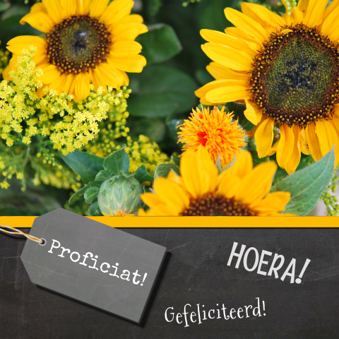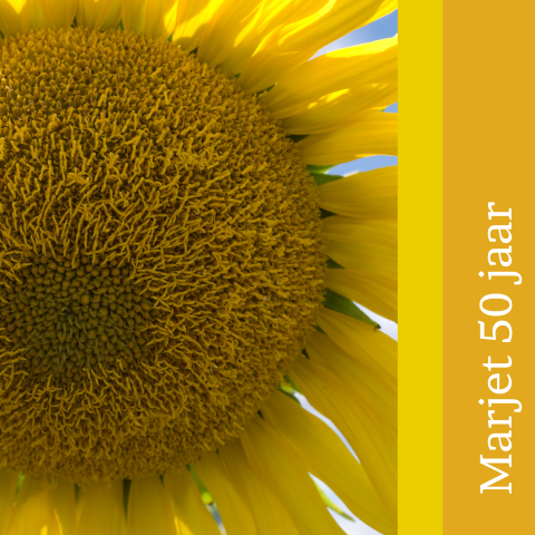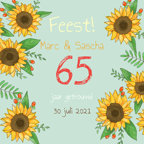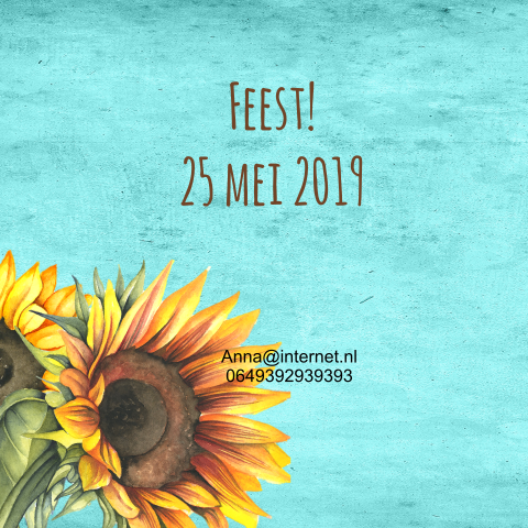 Uitnodiging 60e verjaardag met mooie zonnebloemen en labeltje van kraft. Klik op een periode waar je meer.